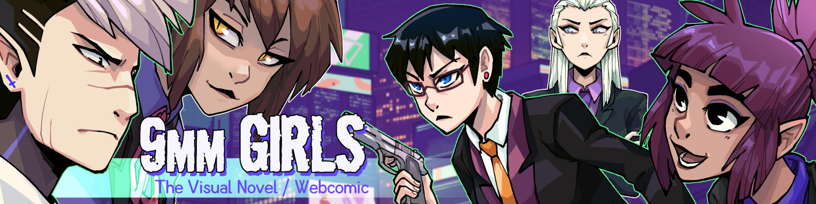 No time for coffee and donuts, the clock is ticking and you have strange individuals to question, shady places to explore and a life changing decision to take!9mm Girls The Visual Novel is a LGBTQ+ urban fantasy/action project produced by the duo Soliko6 The project focuses on the relations between you (the player) and complex characters while following an intricate storyline taking place in the dark megalopolis of Skyline City.Your choices through the game will impact the ending but also the bonds you wish to build with the characters.